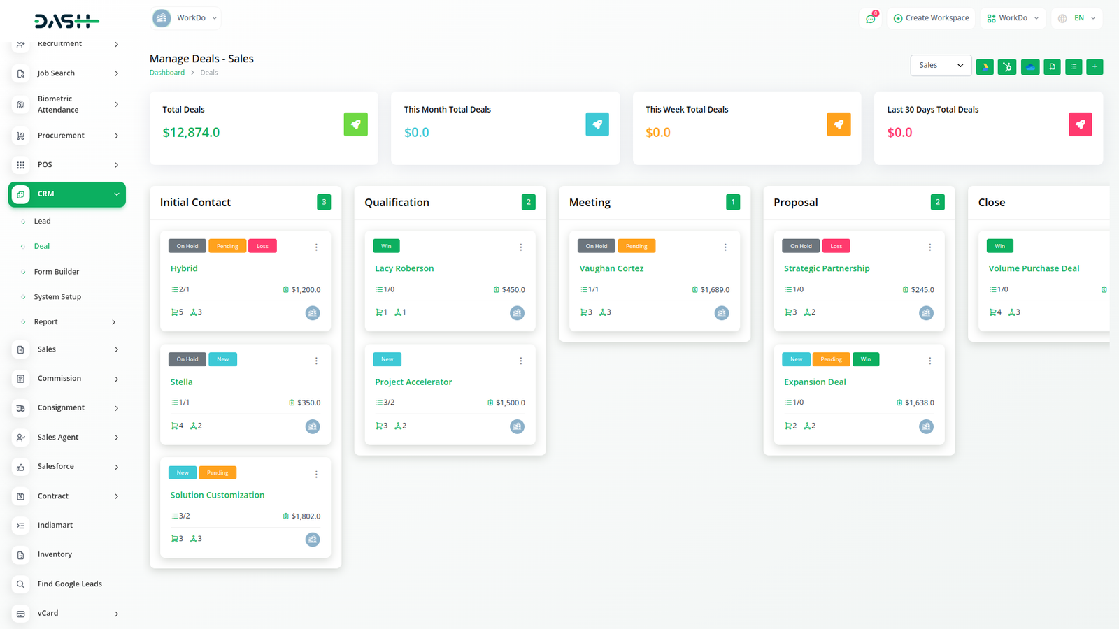 Get an actionable analysis of all your leads, deals, users, invoices, and products - in one interactive dashboard. Create and implement effective business plans, set a maximum number of deals, payment options and do so much more.